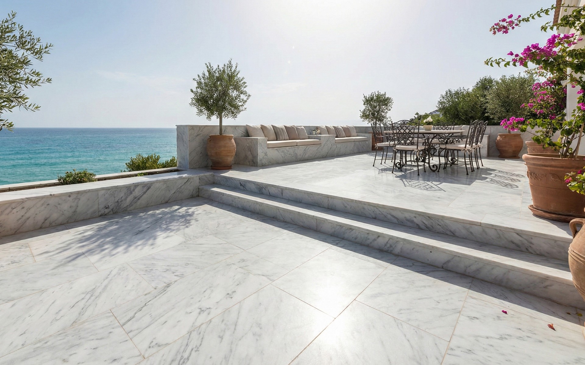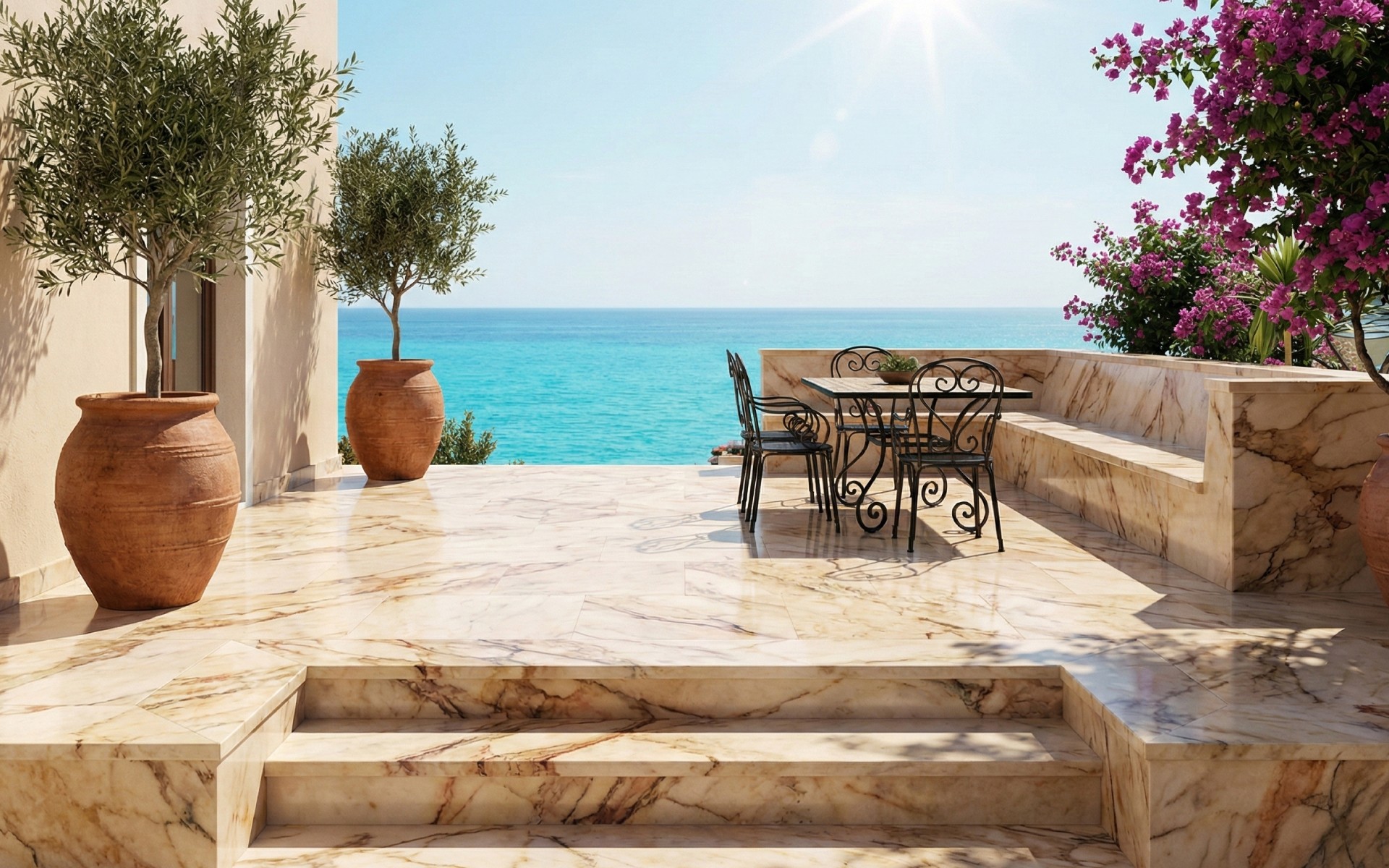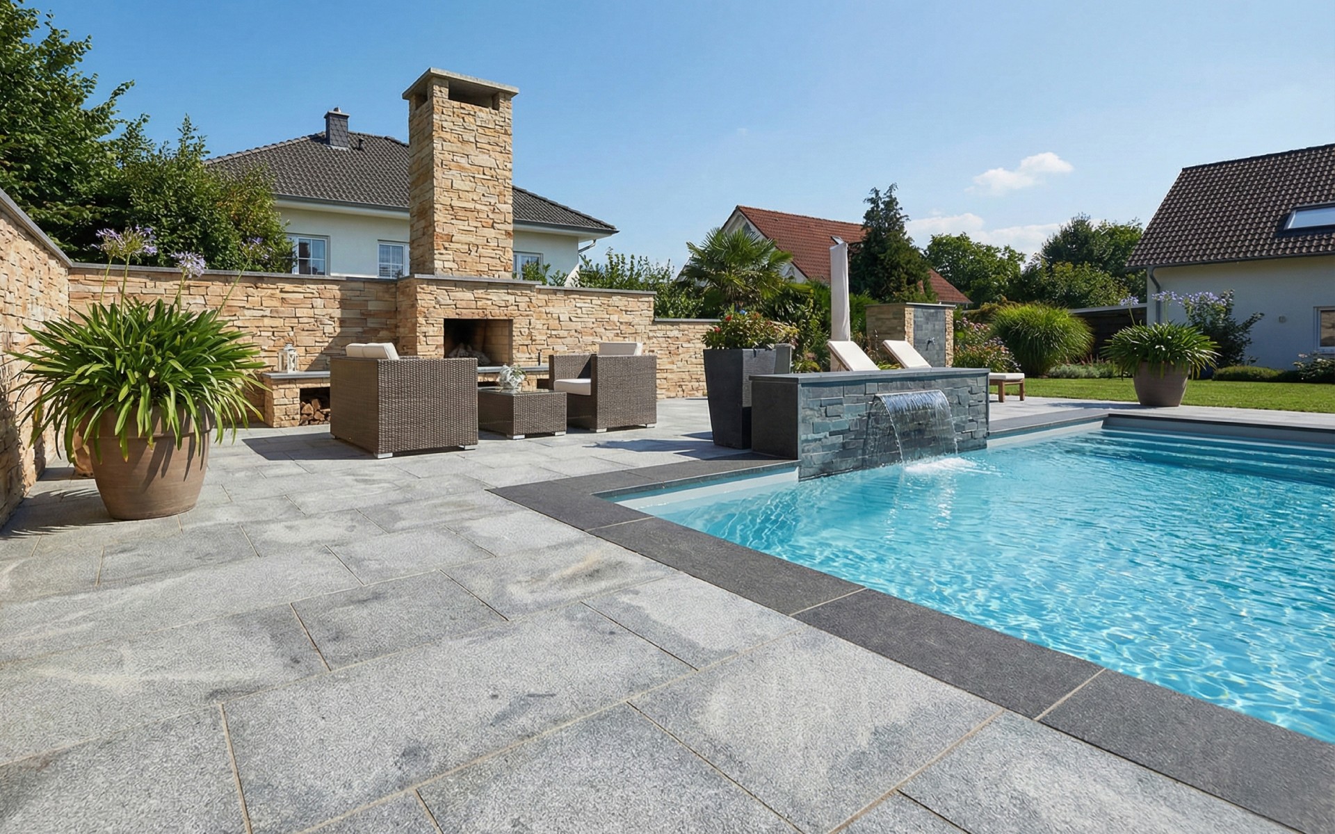 Trawertyn jest lżejszy wizualnie, cieplejszy w odbiorze i bardziej dekoracyjny. Często wybierany tam, gdzie zewnętrzna przestrzeń ma być naturalnym przedłużeniem domu lub ogrodu. Tarasy, patia, strefy basenowe czy elewacje o bardziej „śródziemnomorskim” charakterze to miejsca, w których trawertyn prezentuje się bardzo naturalnie. Trzeba jednak pamiętać, że to kamień porowaty, który wymaga odpowiedniego przygotowania. Wypełnianie porów i regularna impregnacja są niezbędne, ale przy właściwej pielęgnacji trawertyn dobrze znosi warunki zewnętrzne i odwdzięcza się wyglądem, którego nie da się pomylić z żadnym innym materiałem.