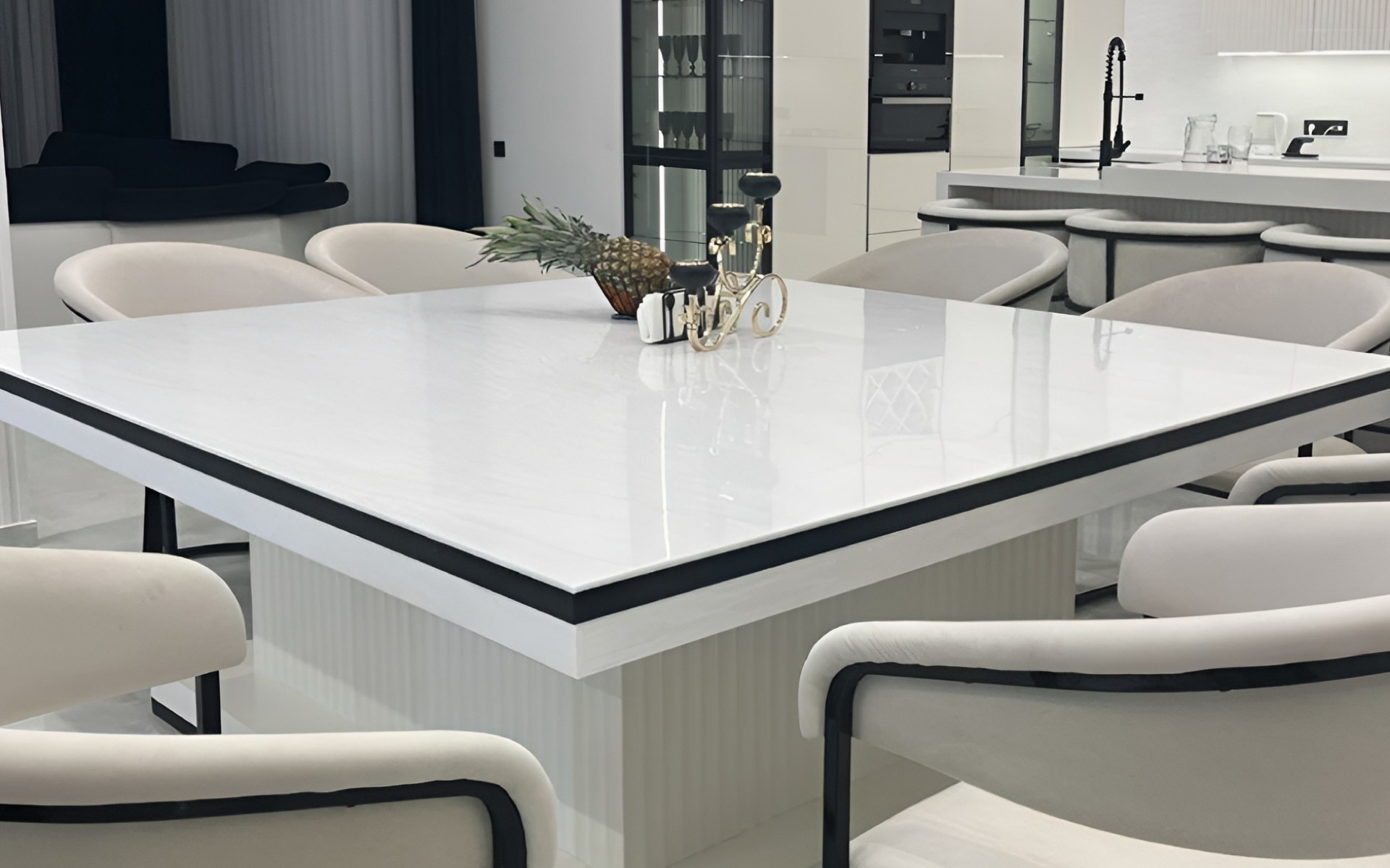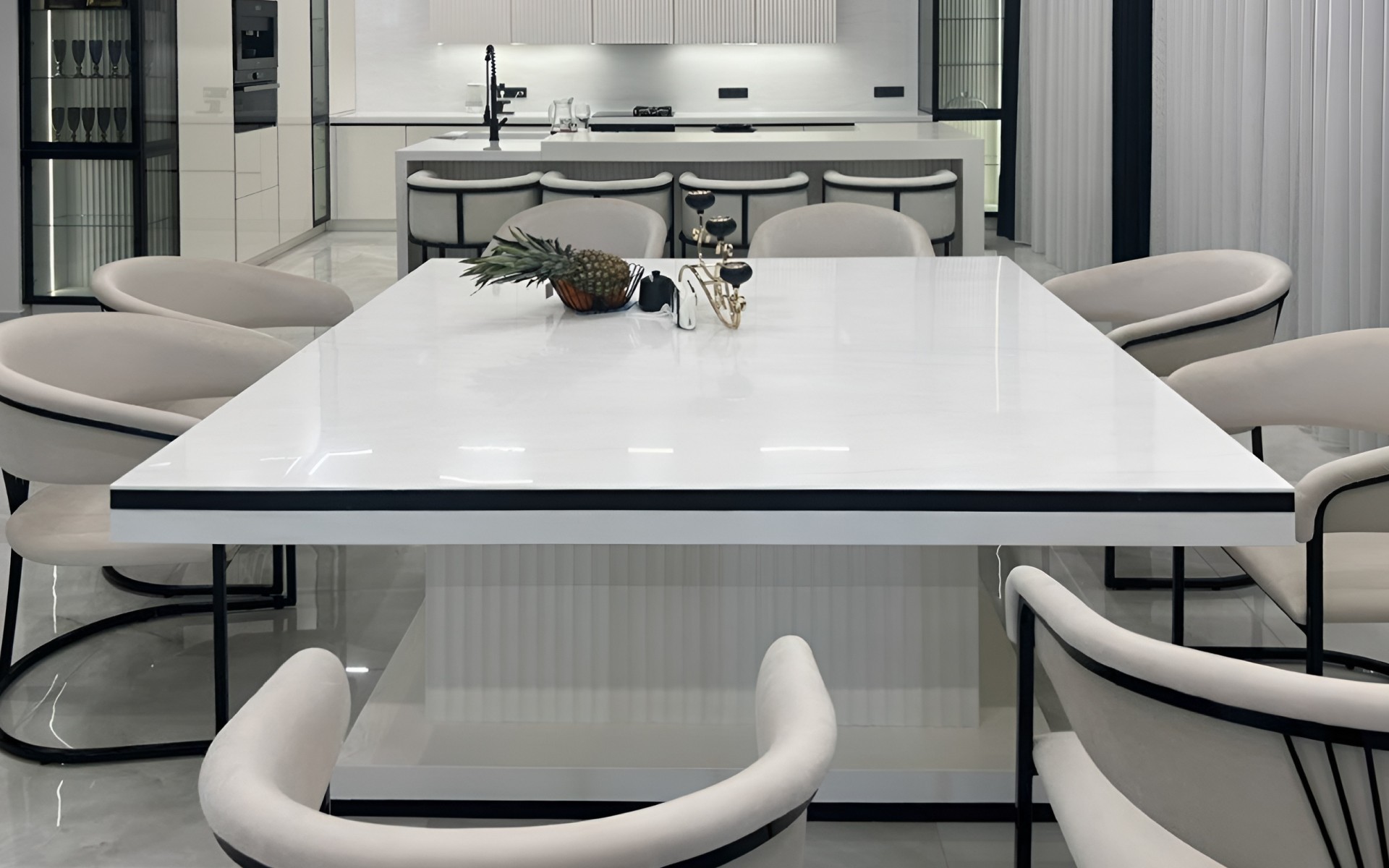 Centralnym punktem tej aranżacji są elementy wykonane z kompozytu mineralno-akrylowego GRANDEX M-707 A Noble Pearl. To dekor z kolekcji Marble Ocean: subtelnie perłowy, z delikatnie rozmytymi żyłkami, wykończony eleganckim połyskiem. Z tego materiału powstał obszerny, reprezentacyjny stół jadalniany, blat kuchenny oraz wyspa. Wszystkie te elementy zaprojektowano tak, aby tworzyły bardzo spójną i nowoczesną kompozycję.
