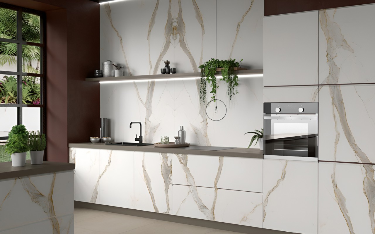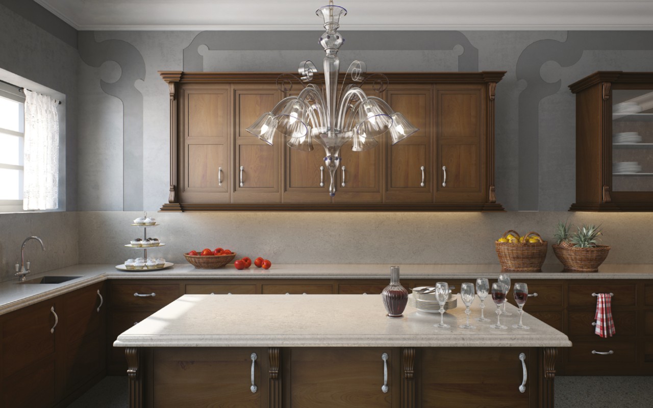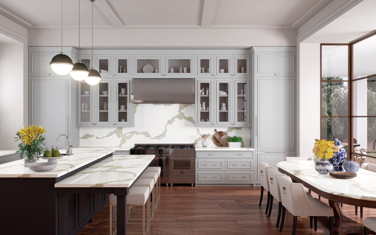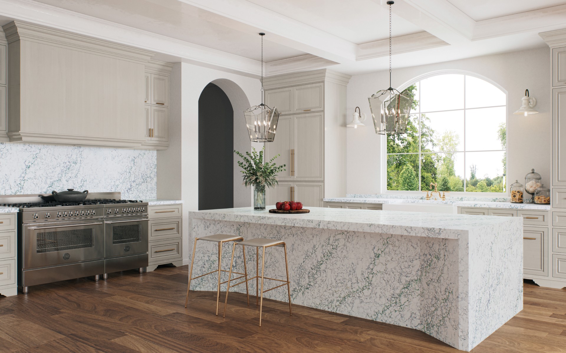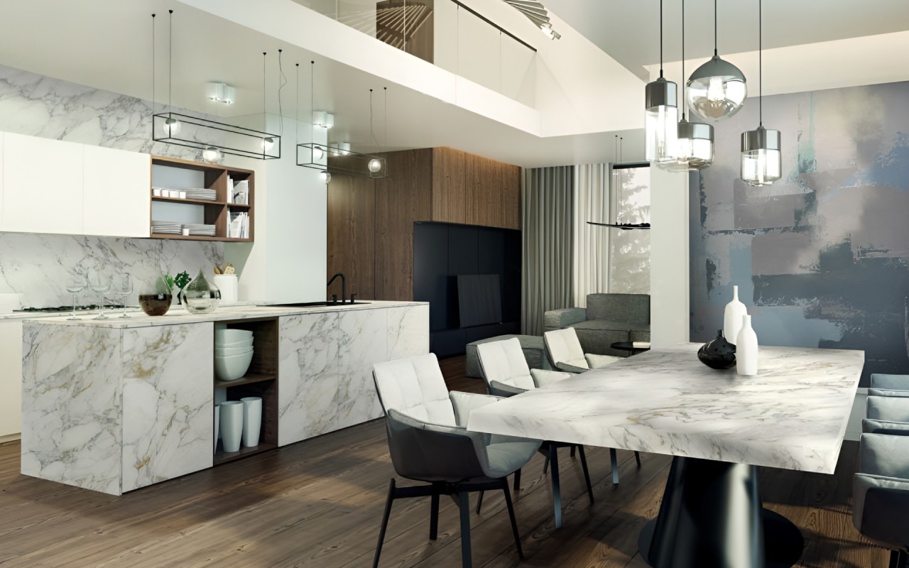 W wielu projektach wnętrz w stylu modern classic spotyka się również kamień, zarówno naturalny, jak i jego zamienniki. Najczęściej wybierany jest marmur (jeden z najpopularniejszych materiałów na świecie, który od wieków uważany jest za symbol luksusu i elegancji; dzięki przeobrażeniom skał osadowych i procesowi rekrystalizacji, marmur zyskuje unikalne i niepowtarzalne kolory i wzory) oraz konglomerat kwarcowy i spiek wielkoformatowy (materiały Architype, wśród których znajdują się kolekcje idealnie imitujące naturalny marmur; charakteryzujące się bardzo wysoką trwałością i odpornością na uszkodzenia mechaniczne, a z uwagi na proces produkcji, pozwalające na uzyskanie powtarzalności lub kontynuacji wzoru czy pełne dopasowanie go do potrzeb danego projektu). Kamień wykorzystuje się m.in. jako materiał na podłogi, okładziny ścienne, kuchenne wyspy, łazienkowe i kuchenne blaty, schody, parapety, fronty mebli, stoły, stoliki i elementy dekoracyjne.
