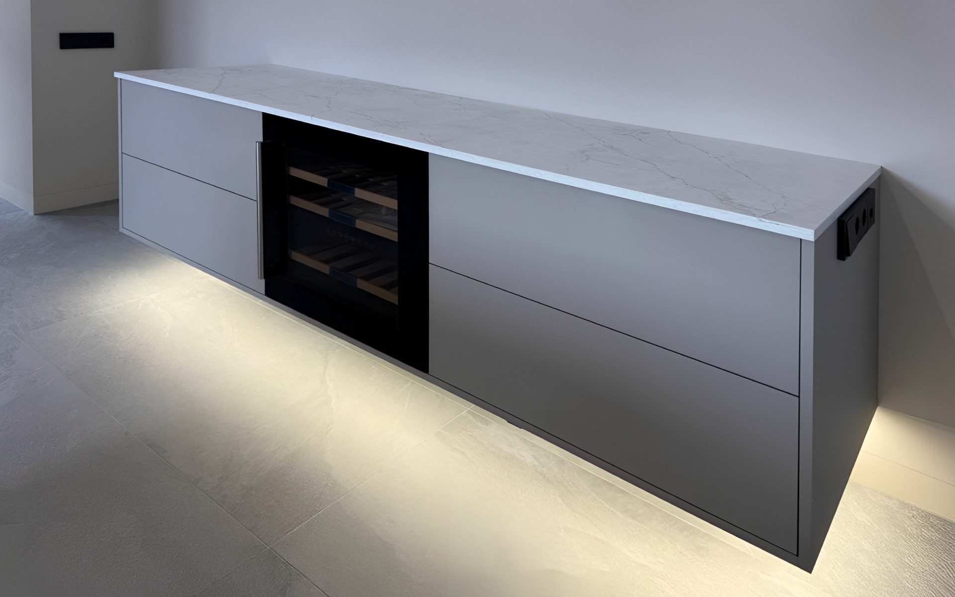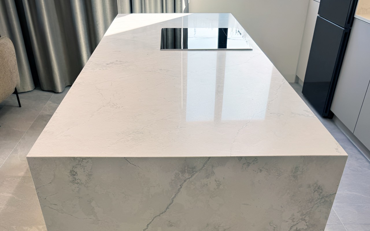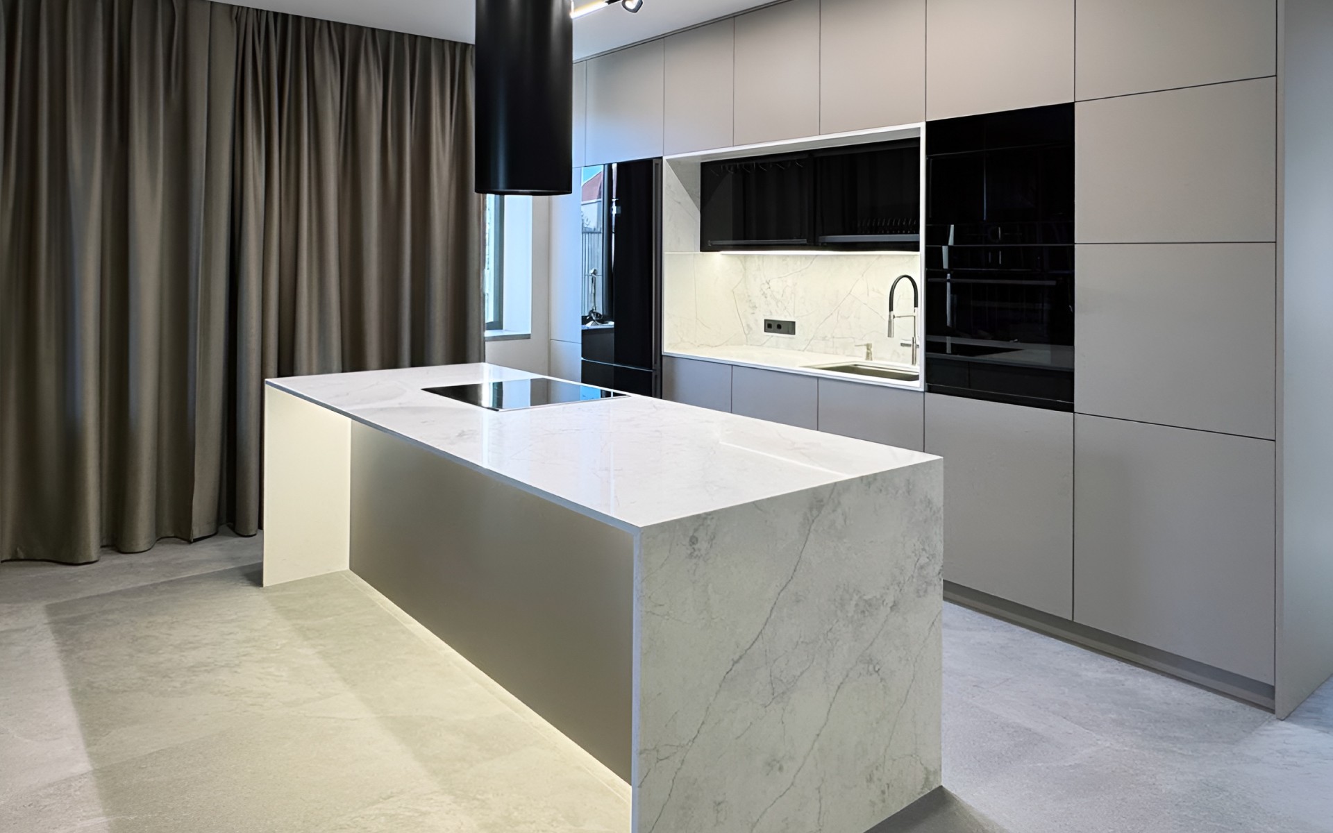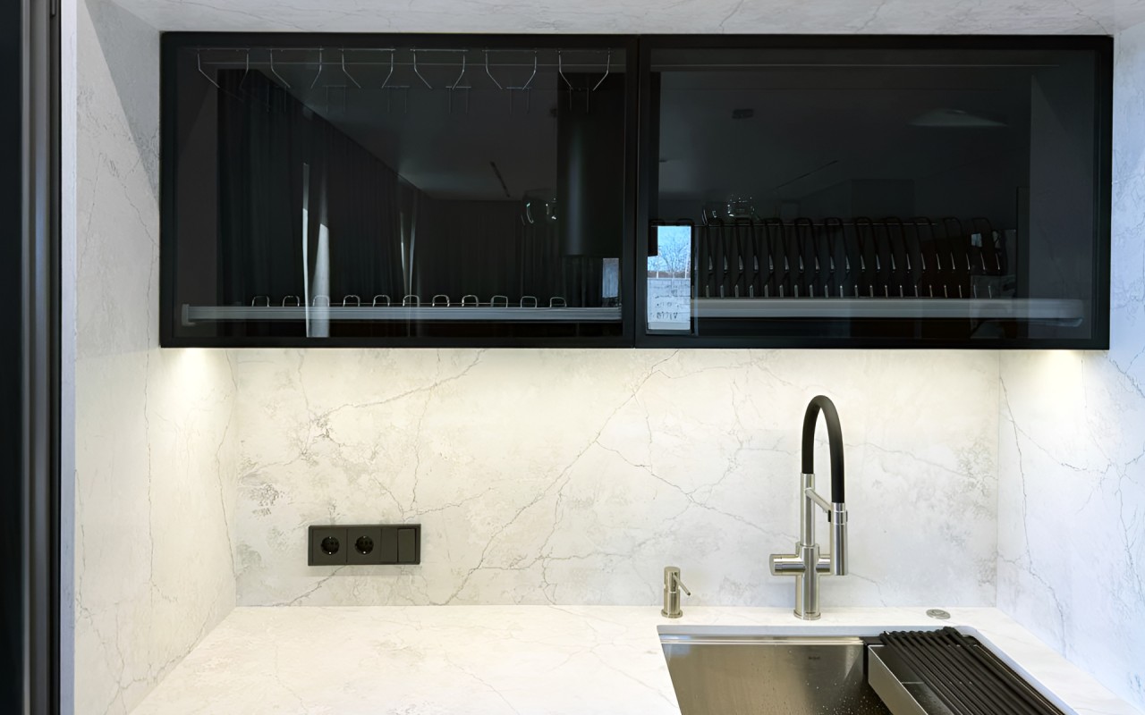 In this project, the Avant Quartz 7540 Calacatta Concorde decor was used in several places: on the worktop, as a backsplash, the casing of the kitchen island, and the top of the wall cabinet. This makes the whole design look consistent and well thought out.